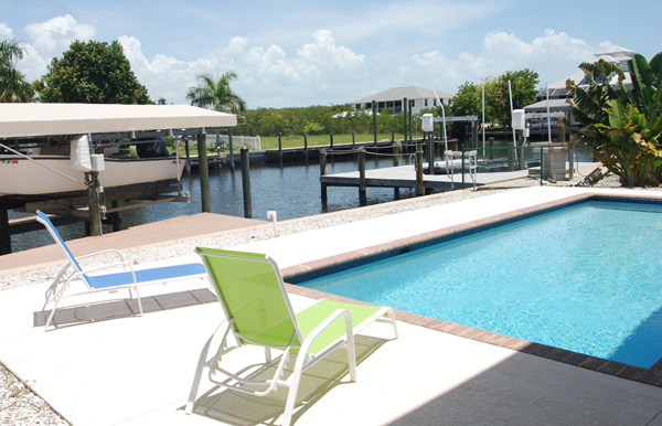 The heated pool is nearly seven feet deep at the north end. Each corner of the deep end has integral chairs molded into the pool shell allowing you to sit in the cool water while soaking up the Florida sun. From these seats your view is the palm trees around the property and several thousand square feet of canal, where you’ll regularly see manatees, juvenile Tarpon, leaping Mullet and even the occasional dolphin.